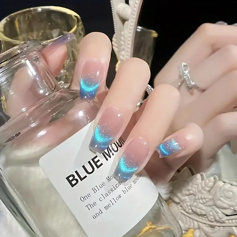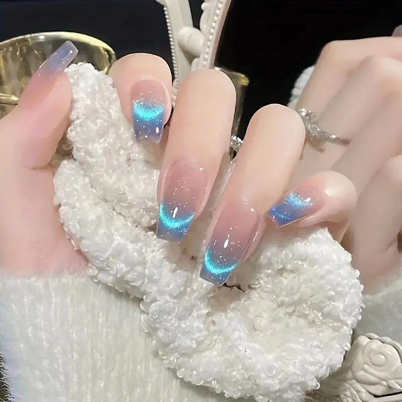 24pcs Aurora Blue Gradient Press On Nails, Glitter Fake Nails With Chameleon Effect, Long Ballet Shape Sparkle False Nails For Women Girls