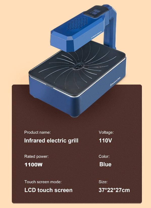 Feature: 1.Heat pipe heating Control the temperature of grease, reduce oil fume, heat light far infrared heating, and heat up faster. 2.Surround heating The chassis is heated around, and the upper and lower exhausts are evenly exhausted for heat dissipation, which has a long service life and a longer use time. 3.LCD liquid crystal screen Control the temperature by yourself, easily realize the freedom of barbecue, easy to operate, and control the deliciousness by yourself 4.Smokeless BBQ Don't worry about oil fumes, the best choice for family gatherings, colleagues' dinners, one person's food. Specification: Voltage: 110VRated power: 850W Touch screen mode: LCD touch screen Product color: Blue Product size: 37 x 22 x 27cm = 14.56 x 8.66 x 10.62 inch Package include: 1 x Electric Infrared Grill Note: Due to the different monitor and light effect, the actual color of the item might be slightly different from the color showed on the pictures. Thank you! Please allow 1-2cm measuring deviation due to manual measurement. |