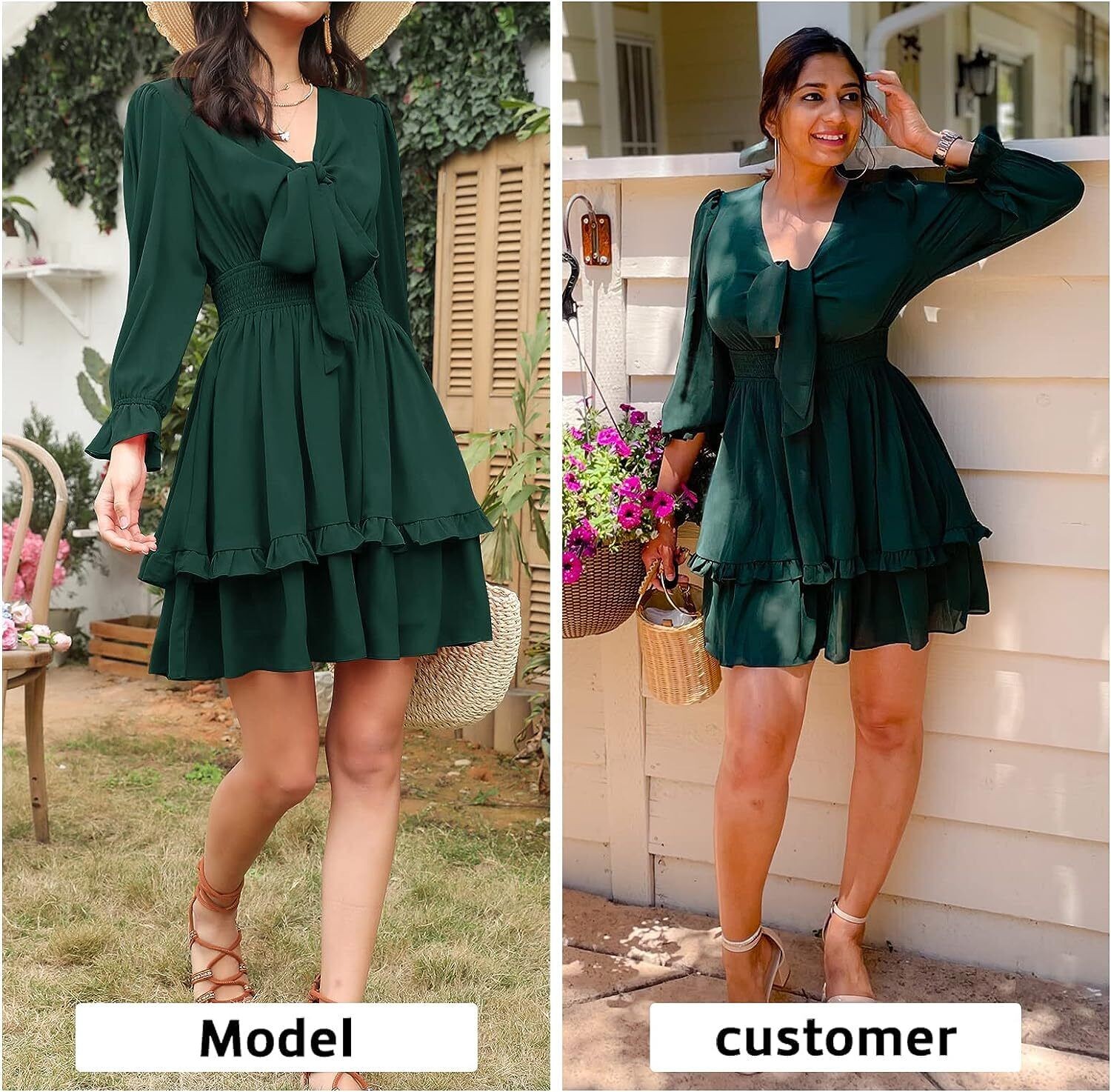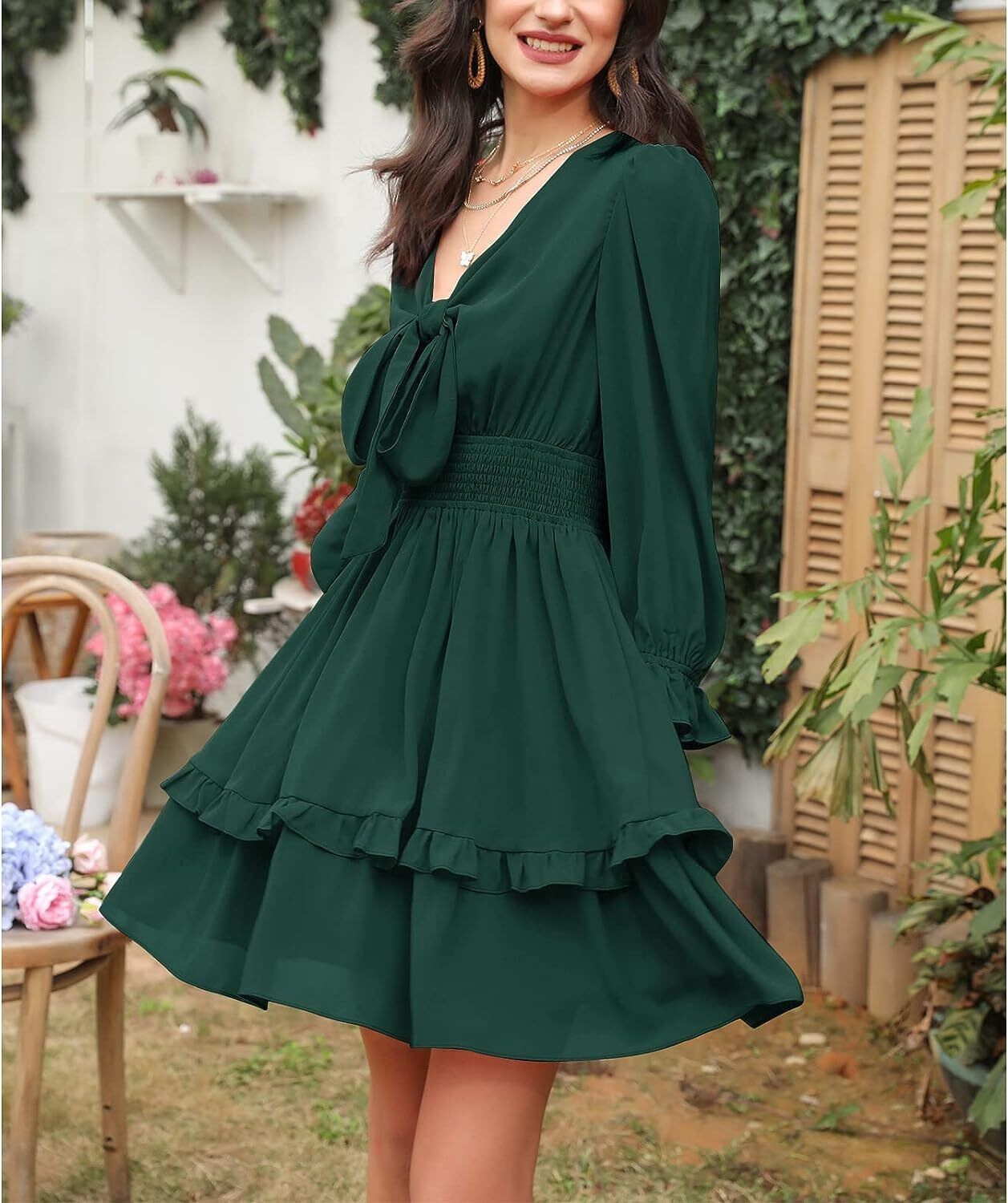 EXLURA Women Tie Front Elastic Waist Tiered Ruffle Layer Floral Balloon Long Sle