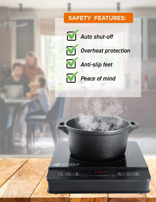 Product details This incredible small induction cooktop (12.99” x 11.42” x 2.56”) helps facilitate amazing meals whether you’re in a small kitchen, apartment, RV or dorm. This compact induction stove (6 lbs.) boasts 8 temperature settings ranging between 160° to 440° F with a 7” diameter cooking surface. Button control panel included as well as LED display and a ceramic surface for streamlined cleaning. Induction cooktop portable comes with overheat protection, 3-hour timer and anti-slip feet to ensure total safety. Our induction burner has a power cord length of 4.9 ft., 120V/1800W in addition to a voltage warning system. UL certified. This versatile cooktop burner comes with ISTA 6A packaging to guarantee total customer satisfaction. PORTABLE & POWERFUL: While our small induction cooktop (12.99” x 11.42” x 2.56”) is lightweight (6 lbs.) it packs a punch with up to 1800 Watts. Cook your favorite meals wherever you go—whether on vacation or in a small apartment, RV or dorm. This induction burner has a 7” diameter cooking ceramic surface that’s easy to clean and can accommodate some of your preferred pots and pans. Boil water, simmer tomato sauce or fry up your favorite protein with this portable single induction cooktop. 8 TEMPERATURE SETTINGS: Our best portable induction cooktop offers a variety of temperature settings so you can find the perfect heat. Temperature options impressively range between 160° to 440° Fahrenheit, guaranteeing the right level of warmth required for your favorite recipes. With this exciting induction cooker, you can control your cooking temperature more precisely than gas and electric. LED DISPLAY: Button control panel and LED display make for easy navigation with this fantastic induction stove. Determine cooktop burner temperature settings at the simple push of a button! SAFETY FEATURES: This portable induction stovetop comes with a convenient 3-hour timer and automatic shut-off for ease of use and peace of mind. Overheat and container protection with voltage warning system included. Induction cook top is UL certified with ceramic surface for easy cleaning. MAKE DELICIOUS MEALS: Whether it’s delicious pasta with homemade marinara sauce or decadent stovetop desserts, this induction burner gives you the option of making amazing meals wherever you are. Our fantastic induction cooktop 1800W requires Induction-compatible cookware for use. Concoct delectable meals with the ease and convenience of our induction countertop burner. |