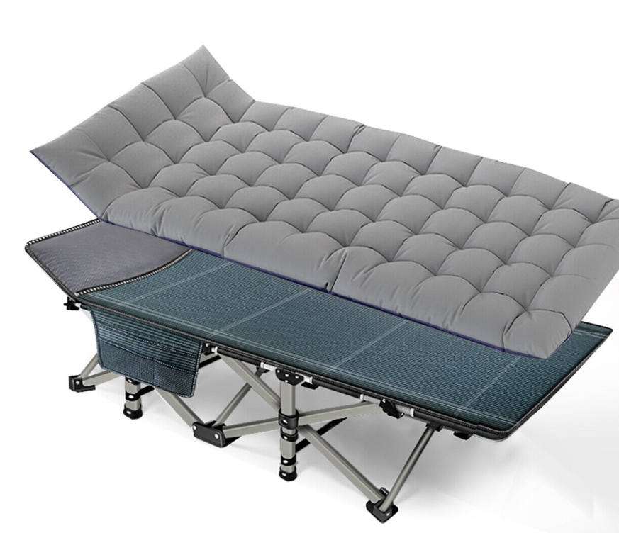 • ?【PREMIUM FABRIC】: This camp bed is constructed in a Double Layer of 1200 D oxford for Superior Strength, Water Resistance & Easy- Cleaning. For cleaning, you can wipe the top fabric and the poles with a wet cloth. The crossbar of the cot is lower than the fabric of it. You will sleep well and won’t feel the bar.